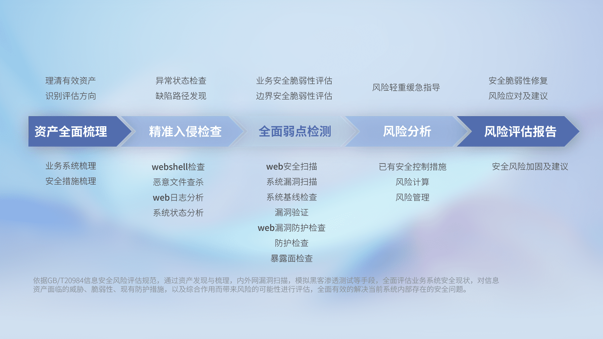 针对客户行业特性,,,,以专业的安全服务+多厂商联合解决方案提供专属的一站式安全管理服务,,,,帮助客户全面感知网络空间威胁,,基于识别、、、、检测、、、分析、、、防护、、、、监测、、、响应的服务理论模型,,从方案咨询、、集成交付、、、评估验证、、优化加固、、、运维运营,,致力于为客户提供完整的闭环管理式安全服务。。。。以实战经验为客户打造高抵御风险的安全体系,,,帮助客户发现威胁、、、对抗威胁、、、处置威胁,,,不断积累安全对抗能力,,,持续保障数字化安全。。。。